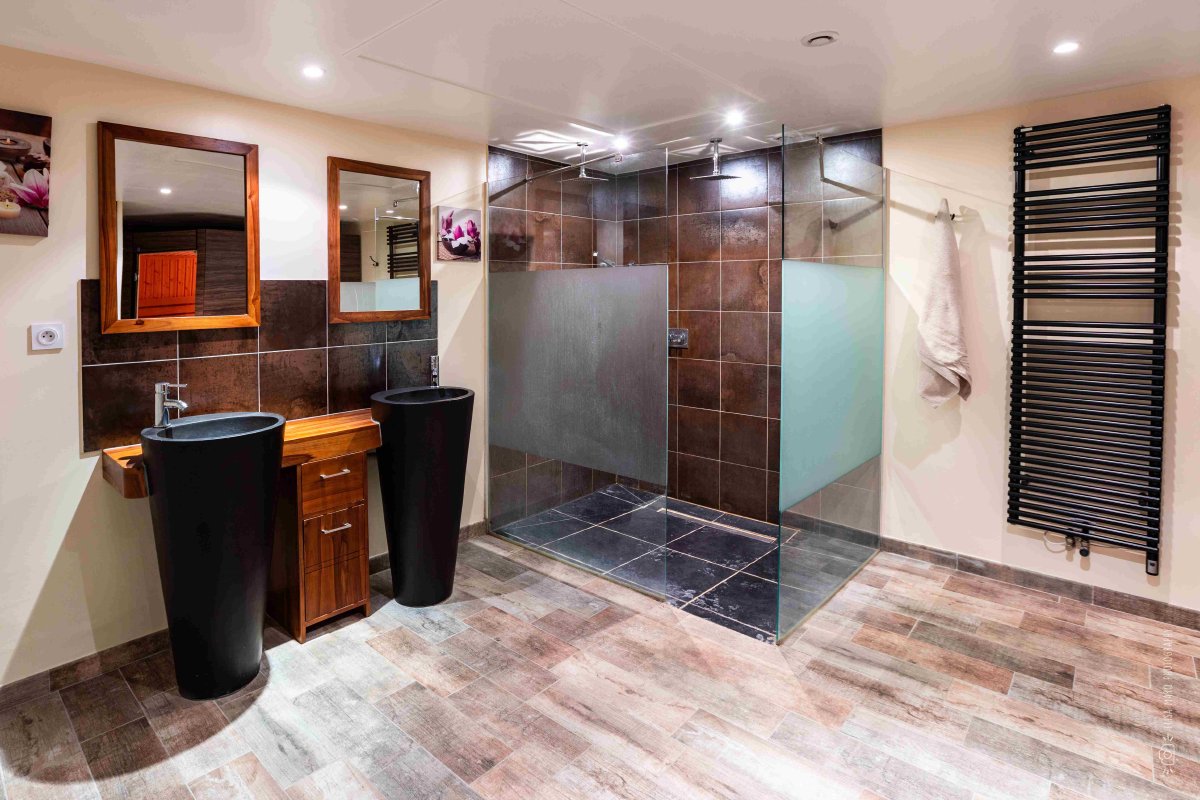 Au sous-sol, laissez-vous tenter par l’immense douche intérieure (1,70m x 1,20m) et le spacieux sauna pour 6 personnes, véritables invitations à la détente après une journée au grand air. Les enfants (et les grands !) apprécieront le baby-foot Stella type toi & moi pour des parties endiablées.