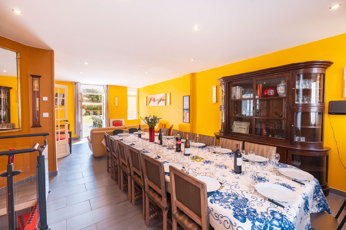 Les 7 chambres, harmonieusement réparties sur plusieurs niveaux, garantissent intimité et sérénité à chacun avec leurs points d’eau privatifs. Les moments de convivialité se vivent autour de la grande table pour 16 couverts, parfaite pour les repas en famille.
